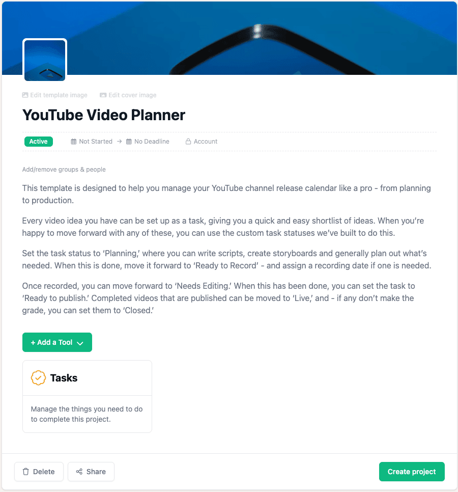 Set the task status to ‘Planning,’ where you can write scripts, create storyboards and generally plan out what’s needed. When this is done, move it forward to ‘Ready to Record’ – and assign a recording date if one is needed.