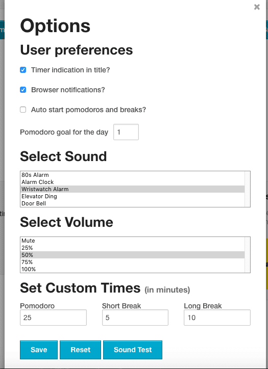 By clicking on the settings tab you can alter the alarm sound, the length of your breaks and working times: