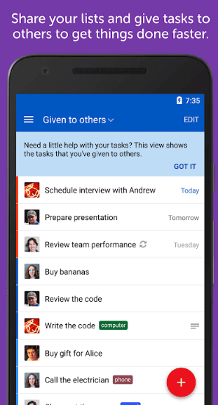 The app also allows users to share lists with others and send reminders to other team members.