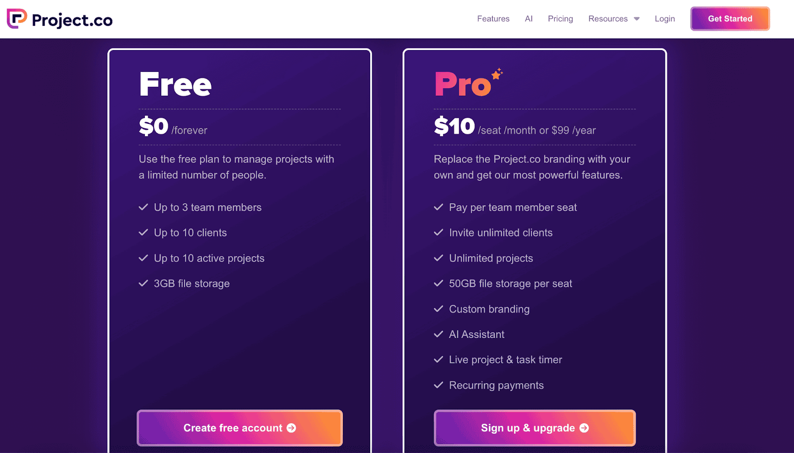 Project.co pricing is simple. You can choose the free forever plan, for up to 3 team members and 10 active projects, or go Pro – which is $10 per user, per month.