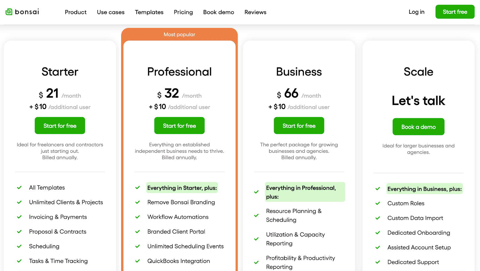 Bonsai starts at $21 per month for their Starter plan, and increases from there. The Professional plan starts at $32 per month and the Business plan starts at $66 per month.