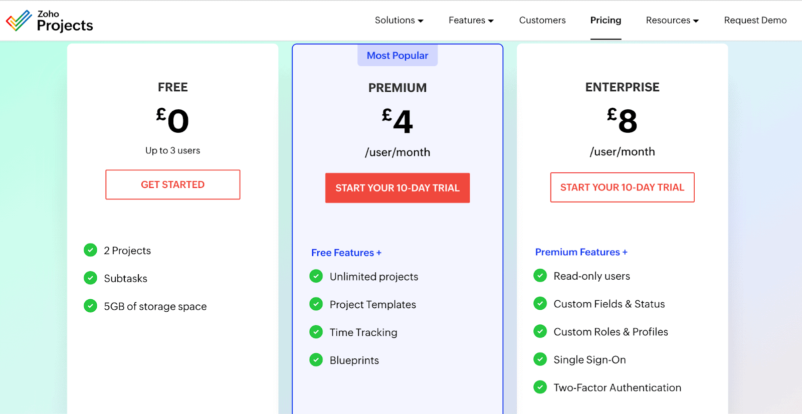 Zoho Projects offers very straight-forward pricing, with three plans to choose from: Free, Premium, and Enterprise.