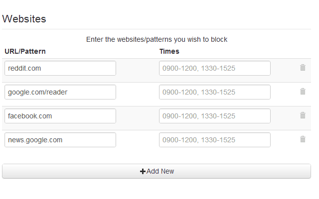 As we’ve seen with other extensions, this lets you set which sites you wish to limit, and then manually enter the times you want to block each site within.