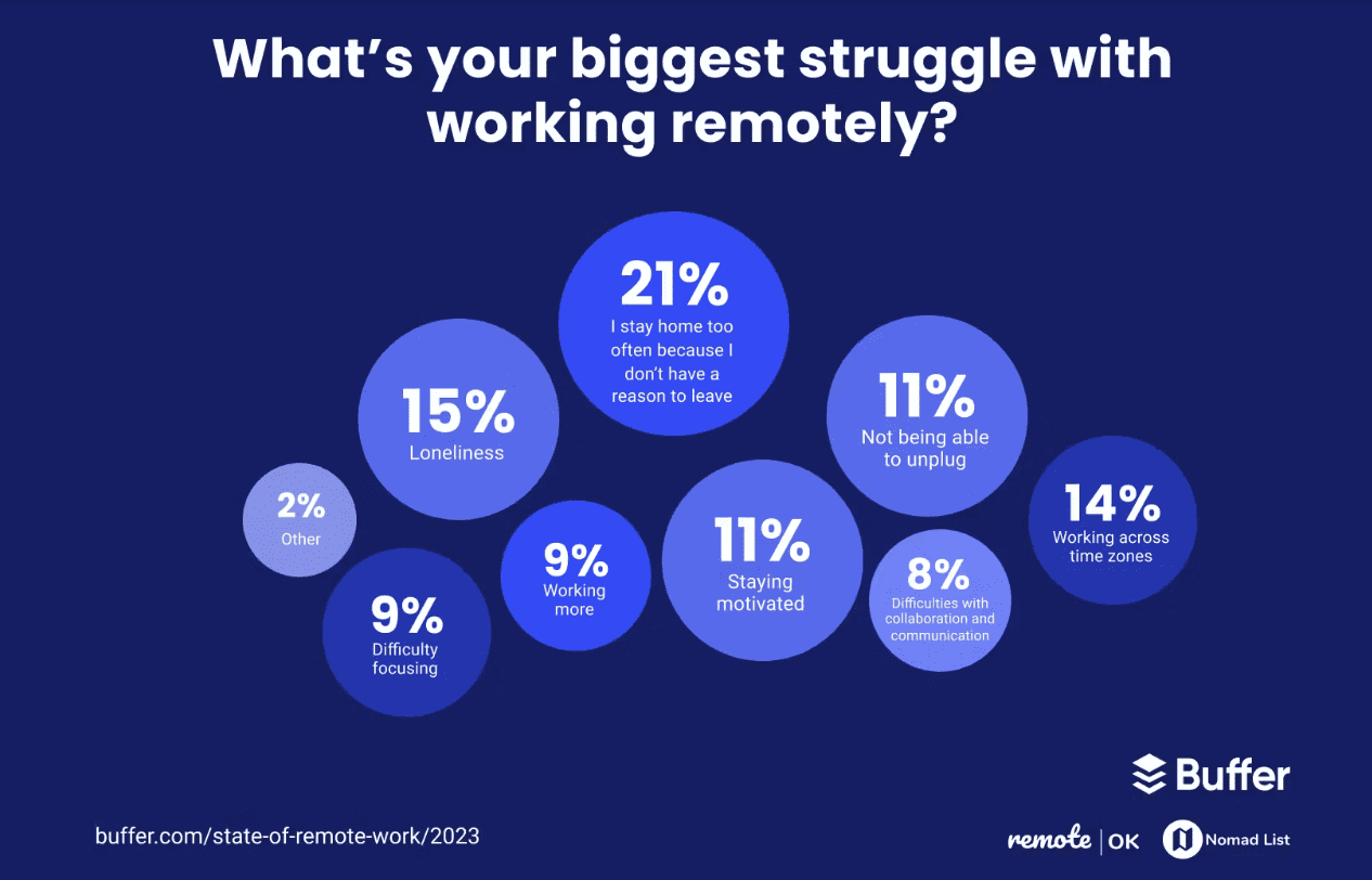 Loneliness took the number two spot in Buffer’s study about remote working struggles, and that’s not surprising.