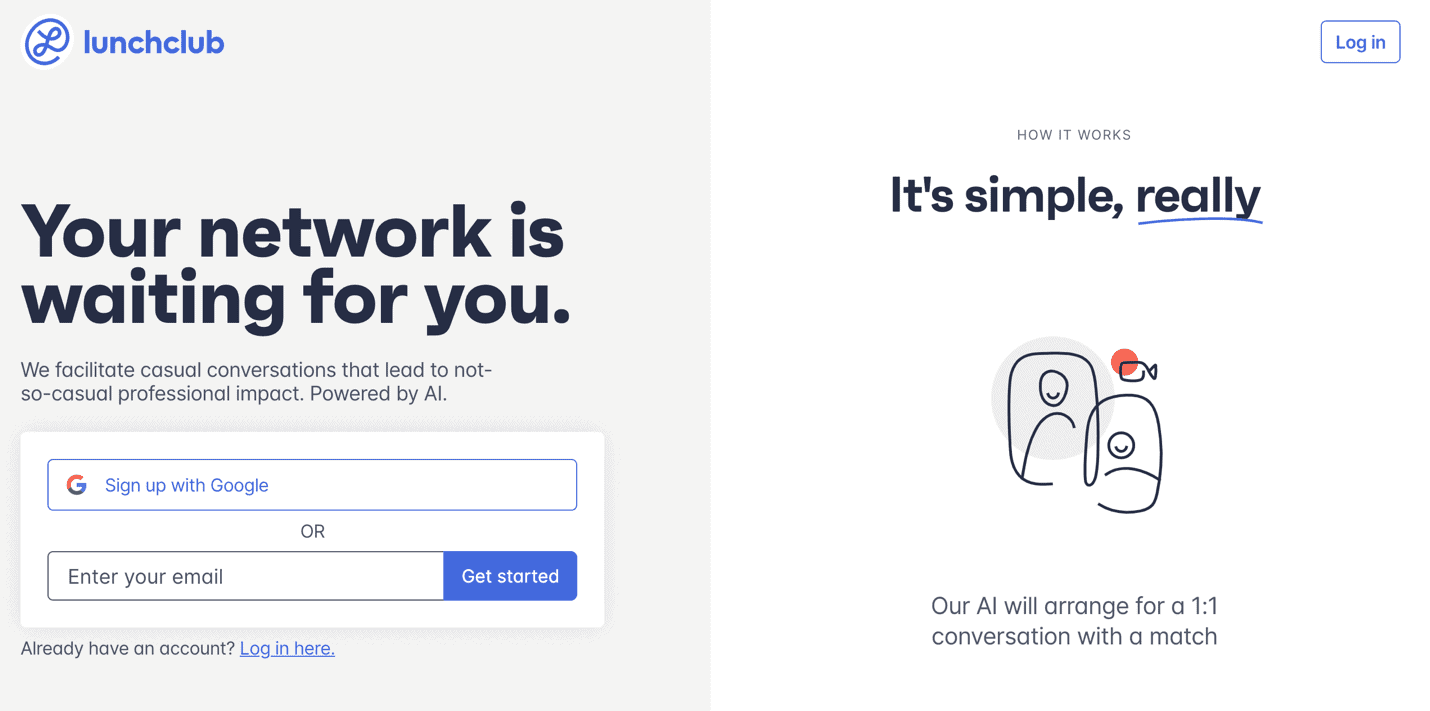 Lunchclub is an American social platform that uses artificial intelligence (AI) and machine learning to connect users with common interests and objectives. Lunchclub is an invite-only platform that enables you to build a profile, identifying your interests, current work projects and any other useful conversation starters.