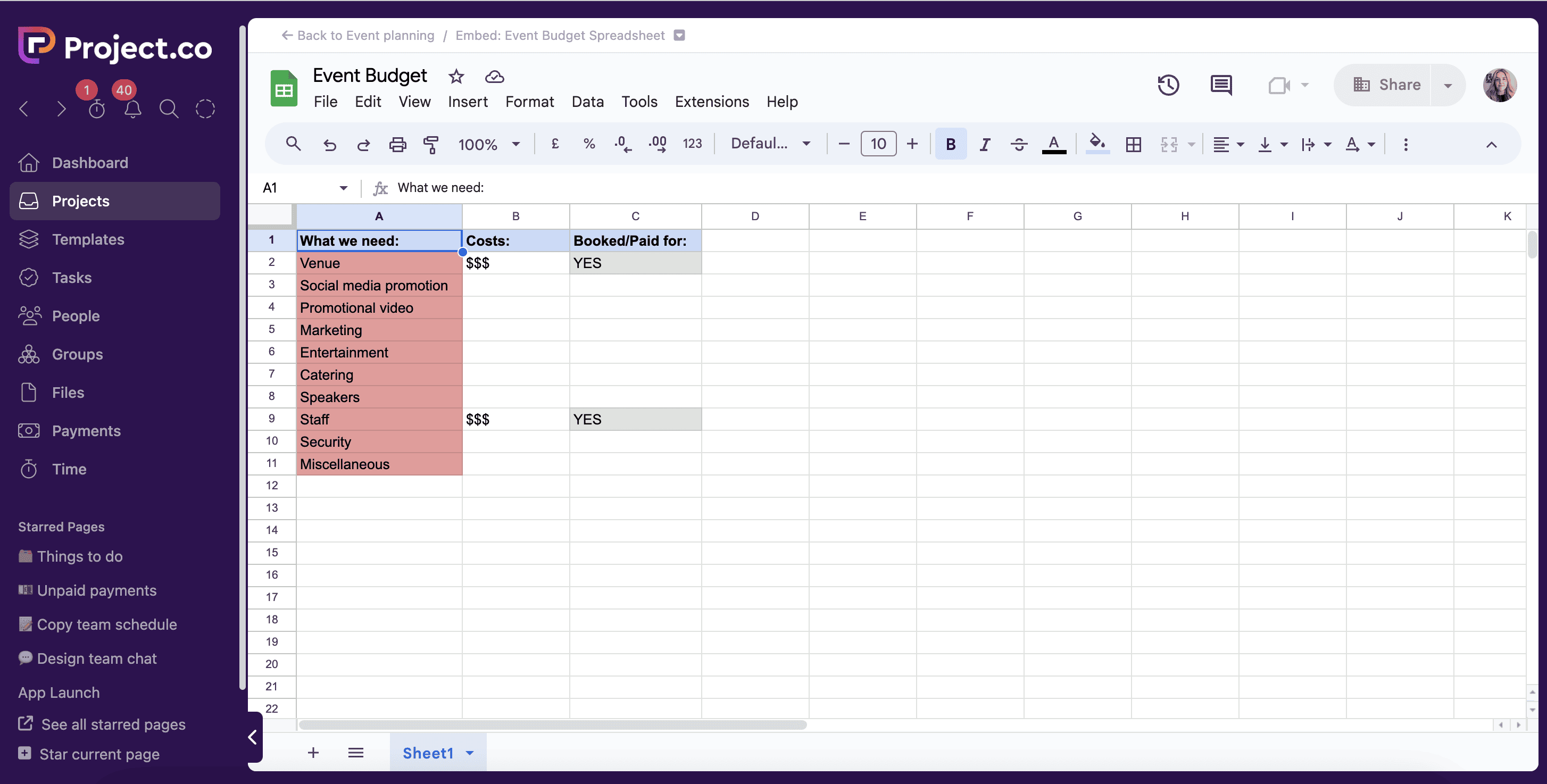 With the Project.co embeds tool, you can embed your Google Sheets directly to your project – meaning that everyone involved in the planning of the event can work on the document at the same time, without ever leaving the project! And this means you can keep your spreadsheets right next to your chat, tasks, files and more – all within each project.