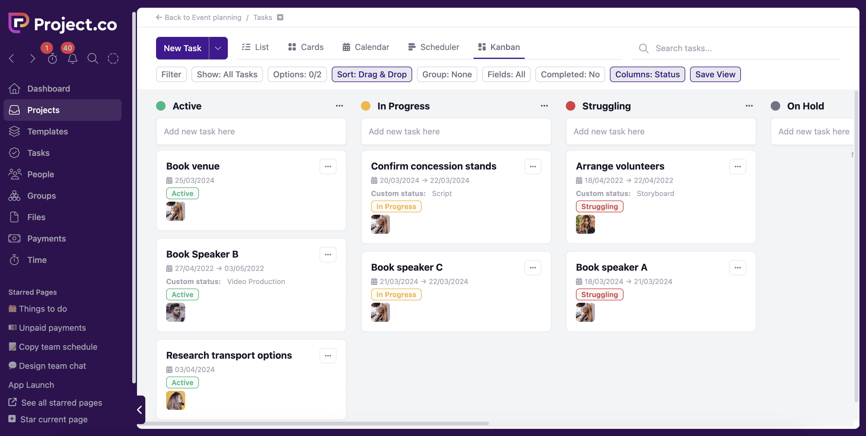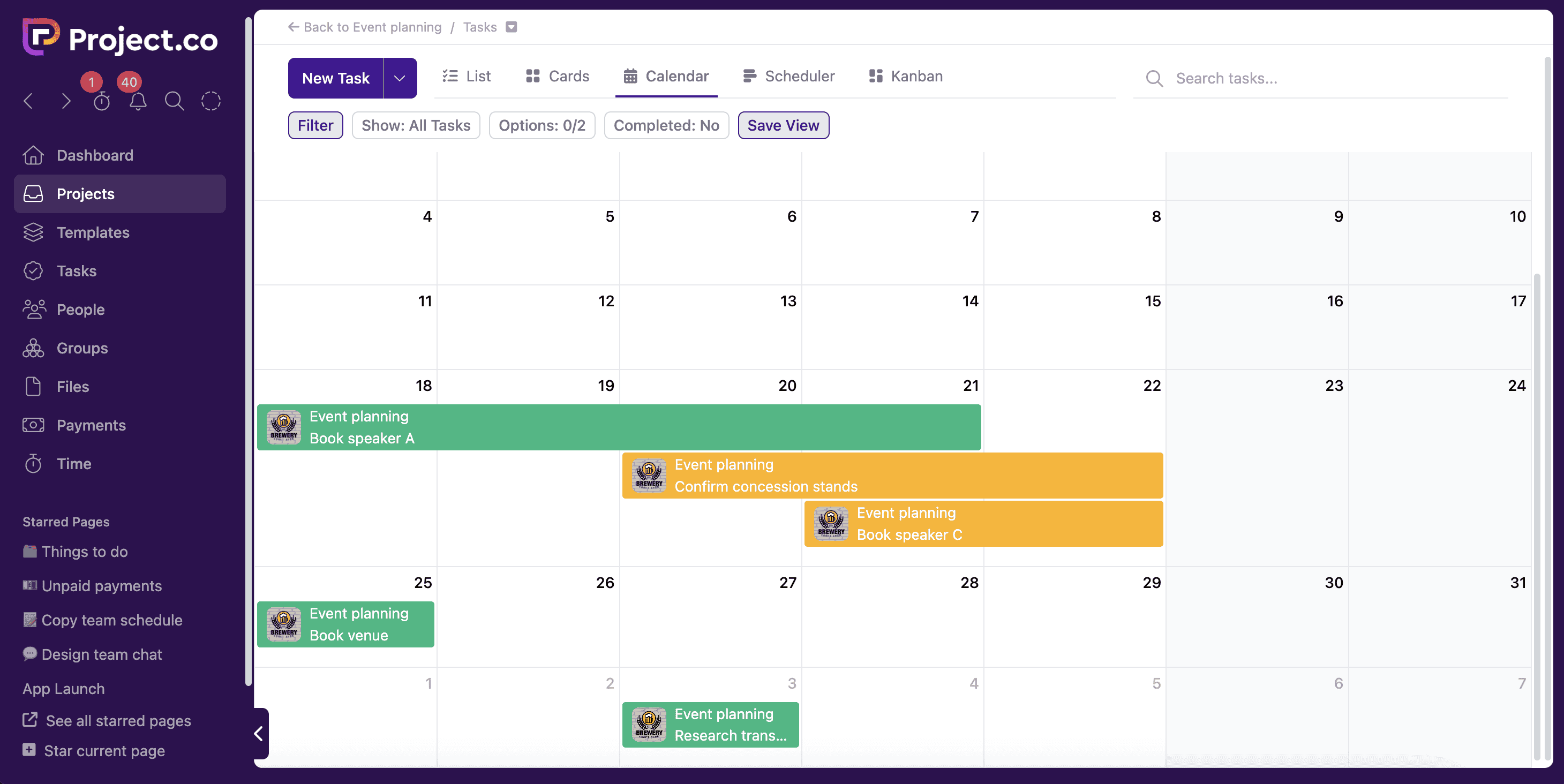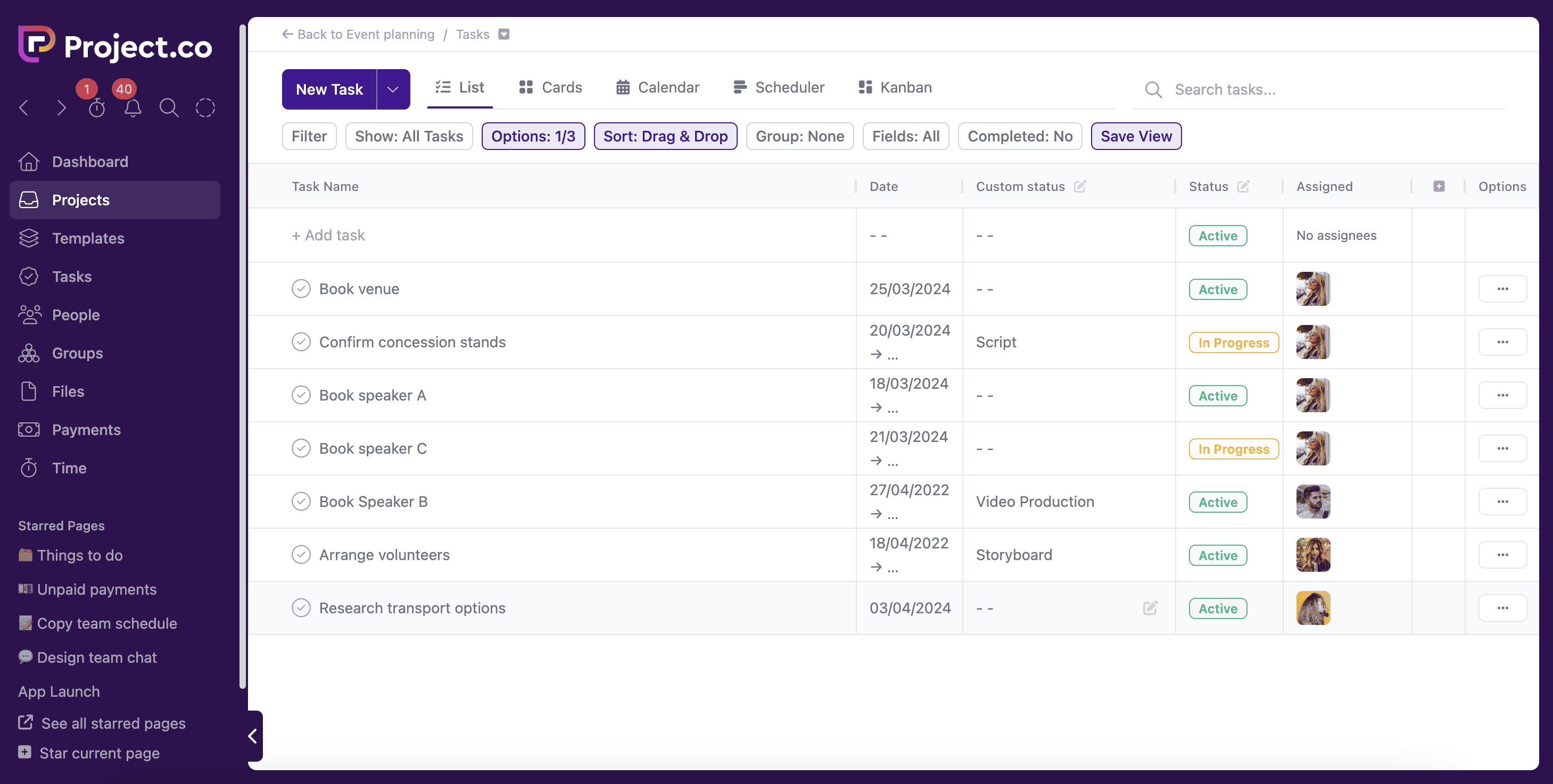 The Project.co tasks feature is a great tool for mapping out your schedule, and our free events planning template actually comes pre-populated with customisable tasks – such as “Book Venue” and “Arrange Volunteers” – making it even easier to get started!