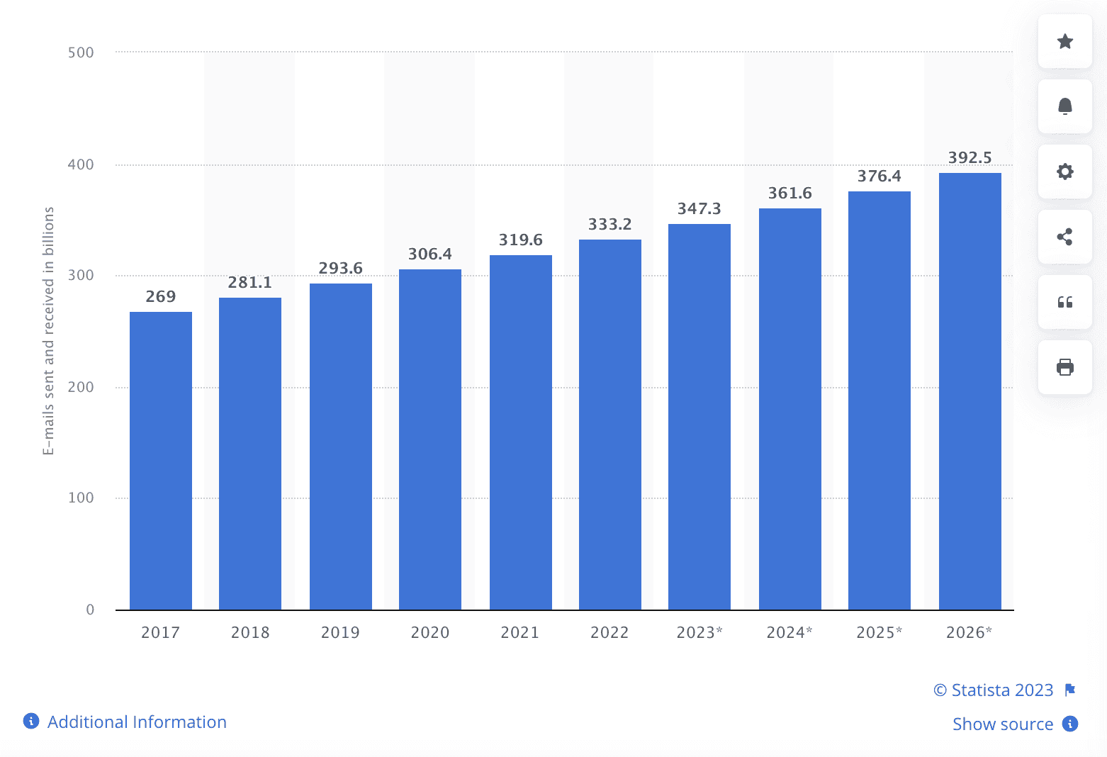 More and more emails are sent every year, with Statista predicting that almost 380 billion emails will be sent and received per day worldwide by 2025. That’s almost 30 billion more than today’s figures. And we’re talking daily here.