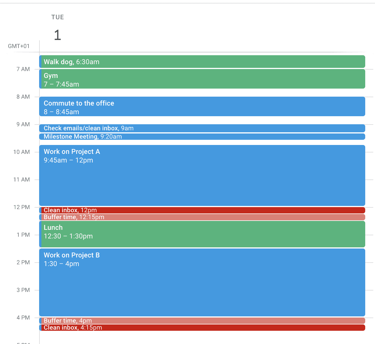 Time blocking is a time management strategy that helps you to manage your daily tasks by scheduling everything out in blocks of time. Here’s an example using Google Calendar: