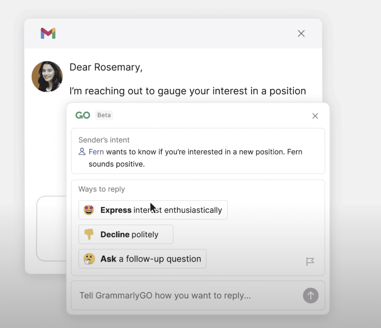 One example is GrammarlyGo. GrammarlyGo is an AI writing tool that can help you respond to emails faster and with more ease.