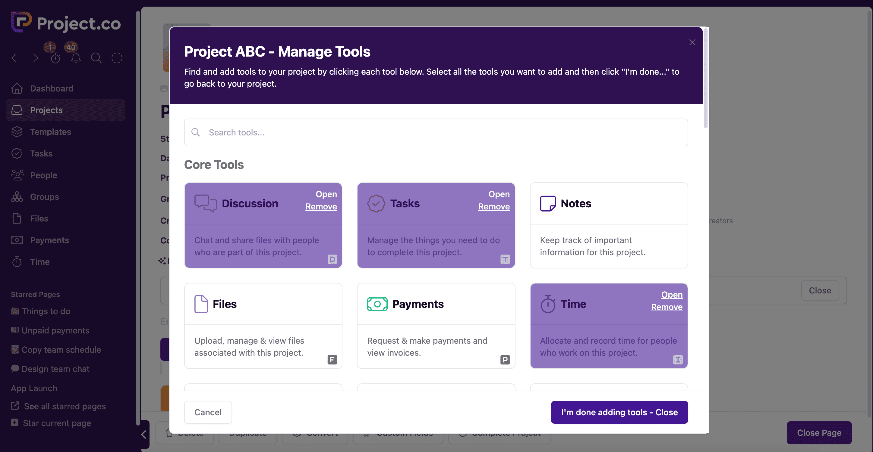 You’ll also want to add tools to your project. For managing a team, the most important tools are probably going to be Tasks, Time, and Discussion.